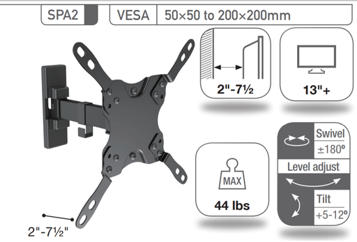 Sonora SPA2 - Support mural 2 bras articulable pour téléviseur 13" et plus maximum, 44lb max.